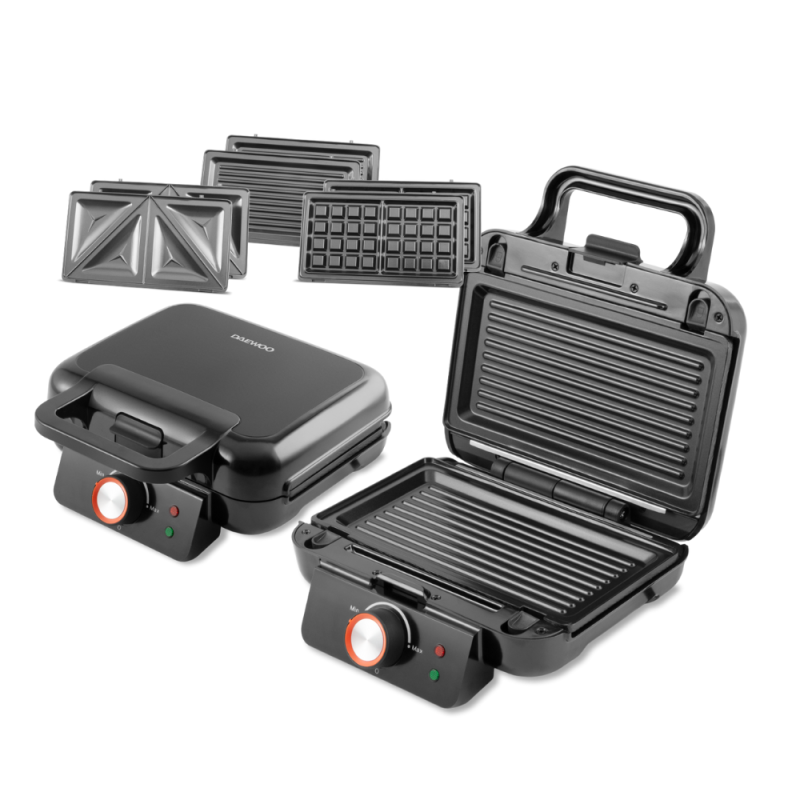 La sandwichera multifunción Daewoo 3 en 1 combina practicidad y versatilidad en un solo equipo. Con 1000 W de potencia y un control de temperatura ajustable con perilla, te permite preparar desde sándwiches crujientes hasta deliciosos waffles o carnes grilladas con el punto justo.